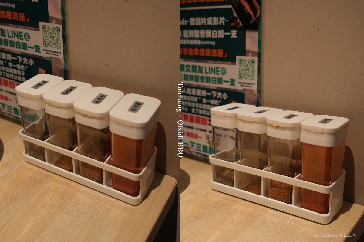 桌上也還備有辣椒粉、孜然粉、麻辣花椒粉和椒鹽粉